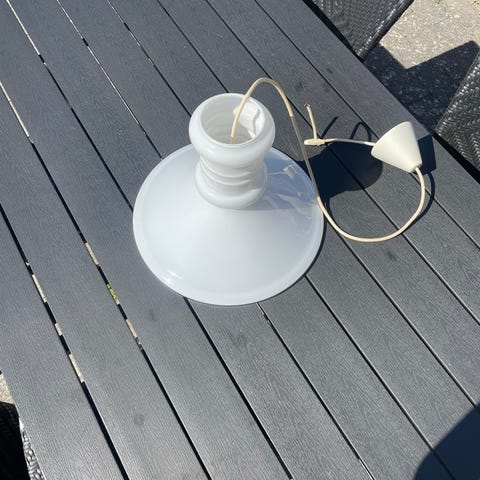 Holmegaard Sidse Werner loftlampe lavet af hvidt glas. Lampen har en rund base og en cylindrisk form, designet som pendellampe itil brug i forskellige rum.