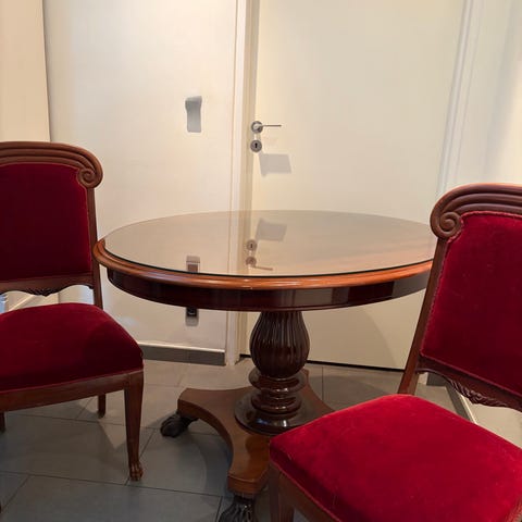 Antikke mahogni møbler - ca200 år gamle. Ægte mahogni arvestykker. Flot velour polstring. Bordet med klapper og skuffe og skabet har enkelte mindre ridser.