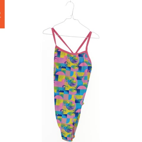 Badedragt til børn med røde stropper og polkaprikket design i røde, orange og pink farver. Dragten har en lyserød base med prikker over hele overfladen. Der er også små dekorative hjerter på det prikkede mønster.