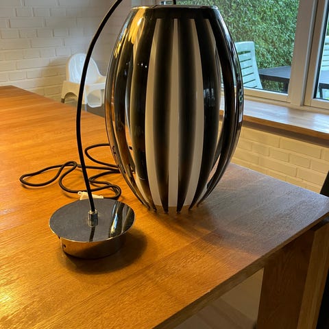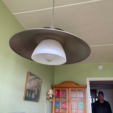Flot mørkegrå loftlampe med en grøn og lyserød kant. Giver et hyggeligt lys