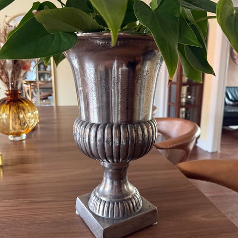 Opsatsen er 17,5 cm høj og Diameter 15 cm. Den har en glat sølvkant i 826 sølv. kr. 225,-