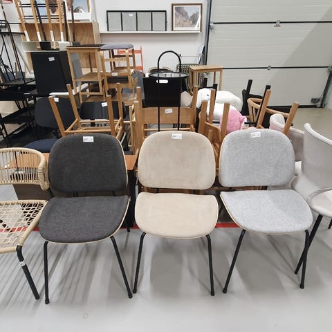 Div. møbler, mm fra tidligere møbel forretning. Stole, borde, afpassede tæpper, voksdug, skabe, fyr træs møbler, mm.