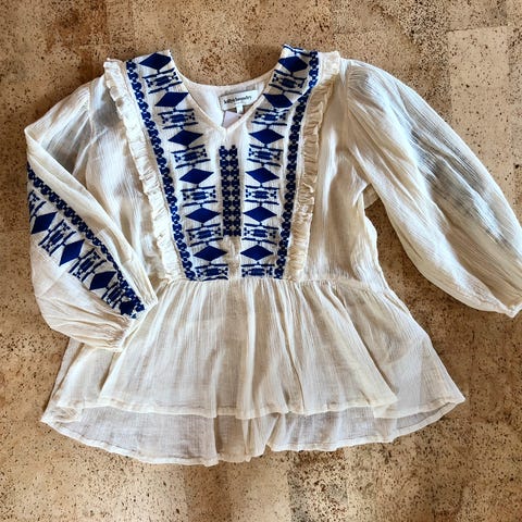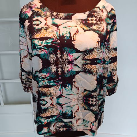 Fin skjortebluse mørkeblå og hvid stribet med korte flagermusærmer