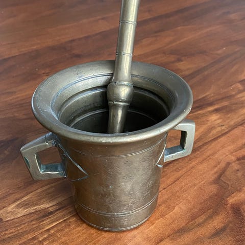 To messing morter med tilhørende støder. Begge morter har to håndtag og er dekoreret med et emblem på fronten som viser en løve. Morterne er velegnede til kværning af krydderier og urter.