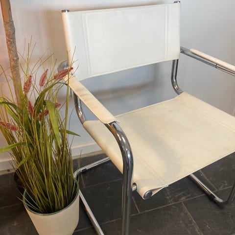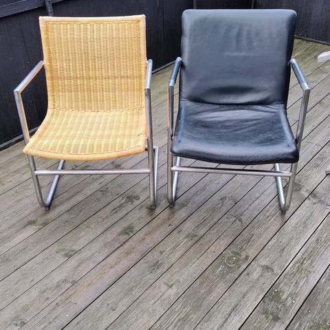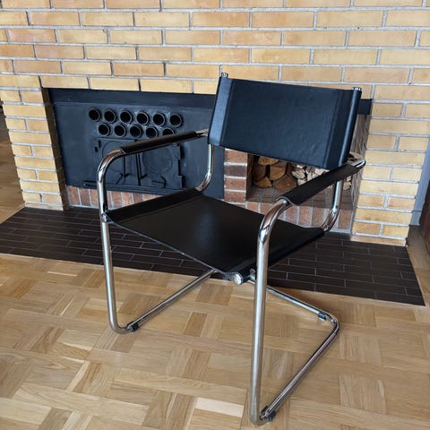 Frisvingerstol i læder/træryg/rustfri stålstel. Italiensk design.