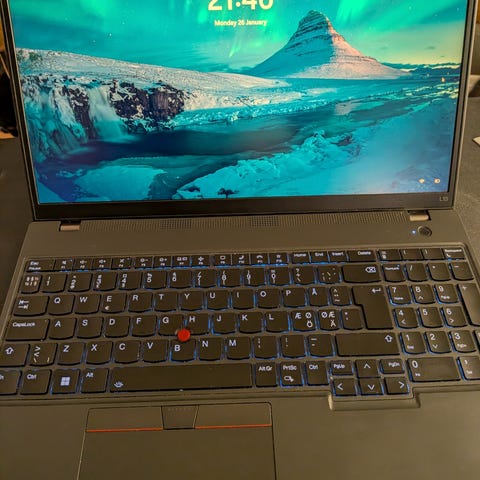 Lenovo ThinkPad laptop with standard keyboard layout and black chassis. The device features a trackpoint and a touchpad for navigation. It has visible wear on the exterior, indicating prior use. Suitable for general computing tasks.