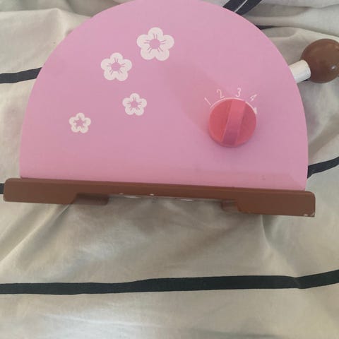 Sjov legetøjs brødrister fra Braun med 2 skiver brød. Brødene kan trykkes ned i toasteren og springer selv op som i en rigtig brødrister. Er I pæn stand. Kommer fra røgfrit hjem.