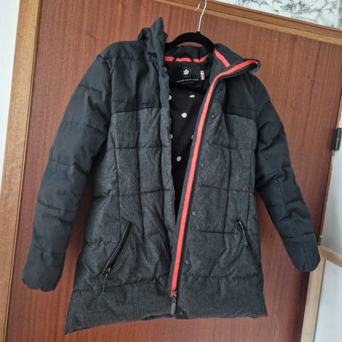 Varm vinterjakke i hvide og grå nuancer. Lukkes med trykknapper og har en lomme foran.