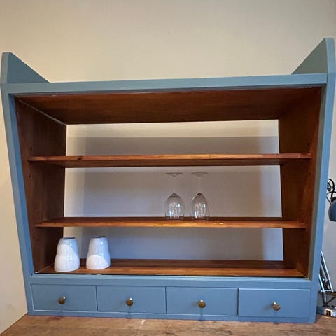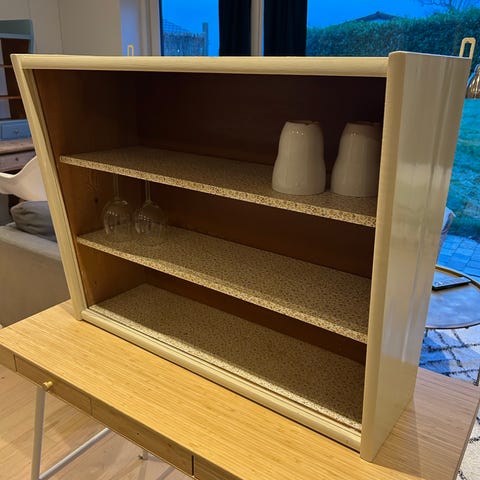 4 hylder og 3 skuffer har været monteret med skydeglas som kan genetableres hvis ønskes. Skabet står i Hellerup.