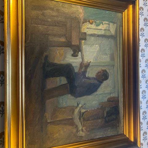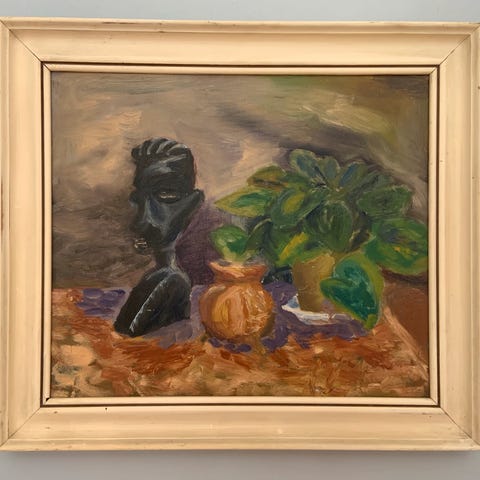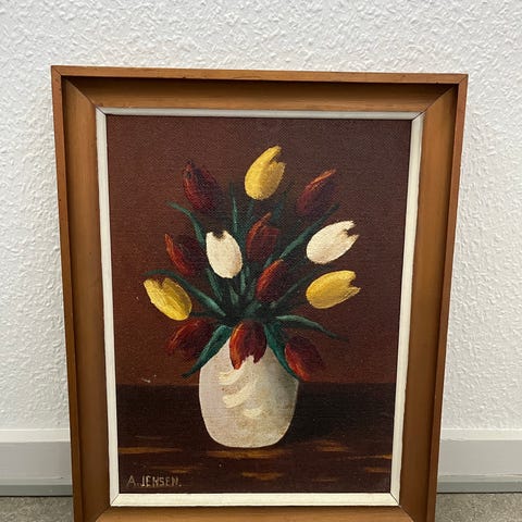 Retro / vintage, smukt ældre maleri: opstilling af skål med æbler og vase med tulipaner på grøn bordplade.