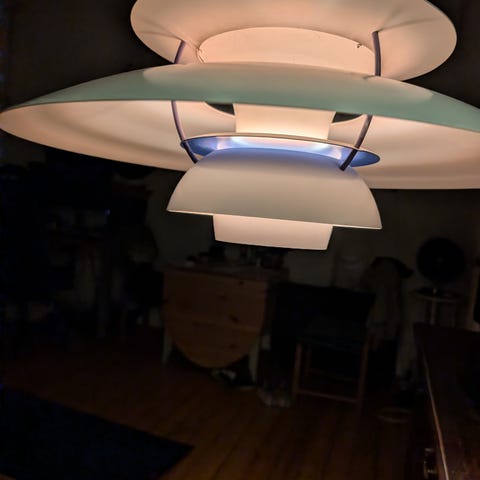 Lampen er i meget fin stand med minimale brugsspor. Farven er lilla med hvid underskærm. 2 meter pæn hvid stofledning medfølger. Sendes ikke.