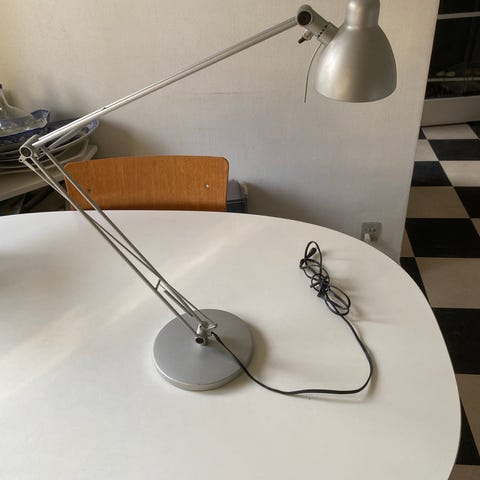 IKEA Gio Ponti bordlampe i sort metal. Lampen har en justerbar arm og en rund base, hvilket gør den velegnet til brug som skrivebordslampe eller læselampe. Designet af Gio Ponti kombinerer funktionalitet med et enkelt, moderne udseende. HK 10681 , Gallery. Højde 50 cm. Sort.