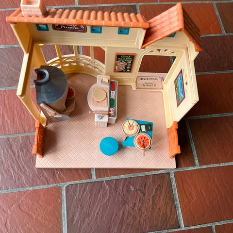 Sylvanian Families pizzeria med detaljerede vægge, vinduer og tag. Indeholder små møbler som borde og stole og pizzaer. Passer til Sylvanian Families figurer og tilbehør. Fremstillet i plast og egnet til børn.