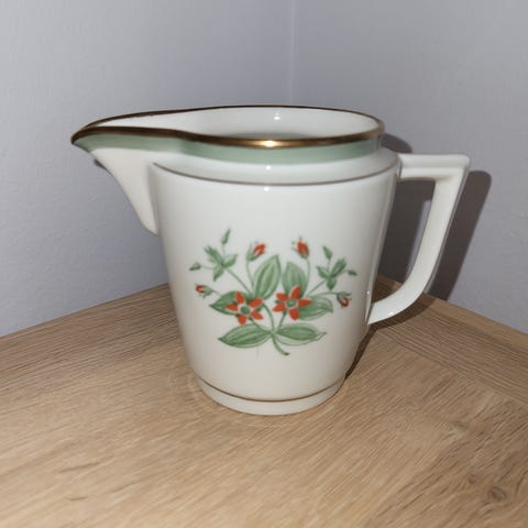 Kgl. 1010 Fensmark : Cremefarvet glasur, koralrød blomst med grønne blade, grønt bånd og guldfilet. Dekorationen med Rød Arve, populært kaldet "Grine til Middag" Det latinske navn: Ana Gallis Arvensis. Design Thorkild Olsen før 1961