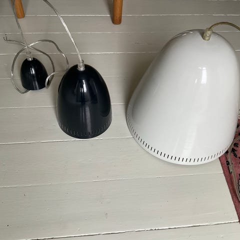 Dynamo formet pendel med den genkendelige hulle kant forneden. Hvid inderside med fatning til pære med stor sokkel, 240 cm ledning og “kop” med ophæng til montering i loft. Kan afmonteres efter eget behov.