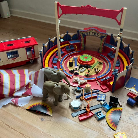 Sjov og underholdende tog der kører og spiller cirkus musik, togfører skydes ud af kanon, abe køre på cykel højt oppe over løven der danser rundt i manegen påhængsvogn med høj gyngestativ samt indhegning 1997