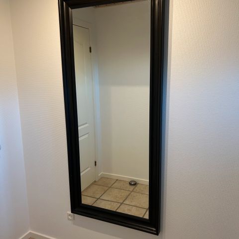 Spejl i mørk træramme på 2 runde stålben med gummi fødder. 163 • 43 cm. Ridse i glasset øverst til højre, ellers er spejlet fint.