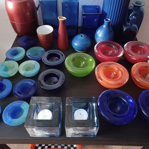 Kosta boda 150kr pr. Sæt. Iittala blå 150kr pr. Sæt. Pernille Bülow 50kr styk. 2 små blå vaser 200kr Lyngby vase 100kr