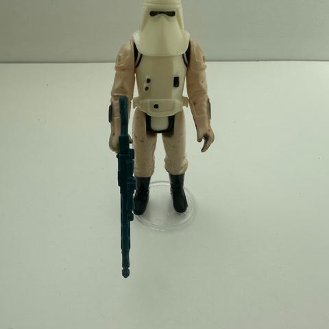 Star Wars Clone Trooper actionfigur med en højde på 80 cm, lavet af plastik i hvid og blå farve. Figuren er detaljeret og inkluderer et våben til leg eller samling.
