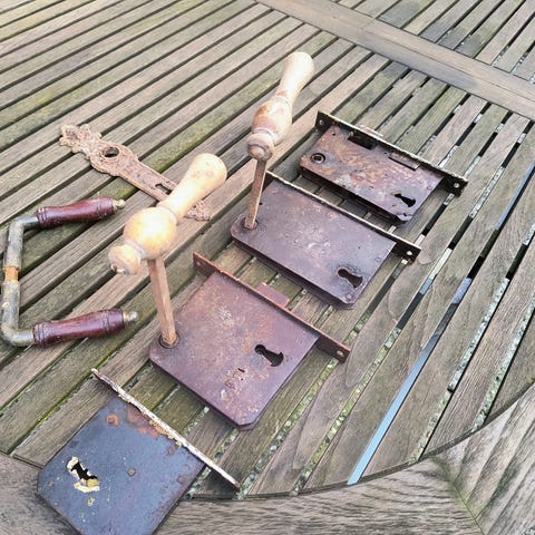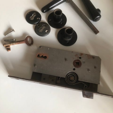 2 sæt gamle jern dørgreb fra ca. 1910 samt låsekasse. Pris hhv 50 kr pr stk og 75 for låsekassen.