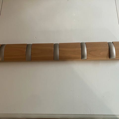 Sort. 50 cm lang. Fylder 9 cm i dybden, når knagerne er vippet ud. Købt i Imerco. Mærket Umbra og designet af Helen T. Miller / Tracy Wong. Ikke-ryger hjem og ingen husdyr. Meget fin stand.