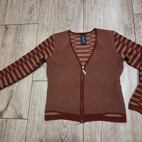 Lys brun og beige med flotte effekter af røde, gule og lysegrønne borter . To Fikse lynlåse bagpå som giver effekten af slids.