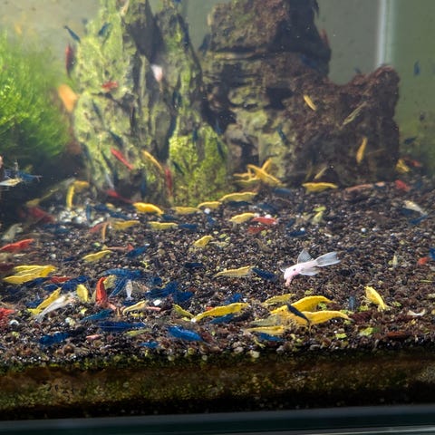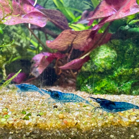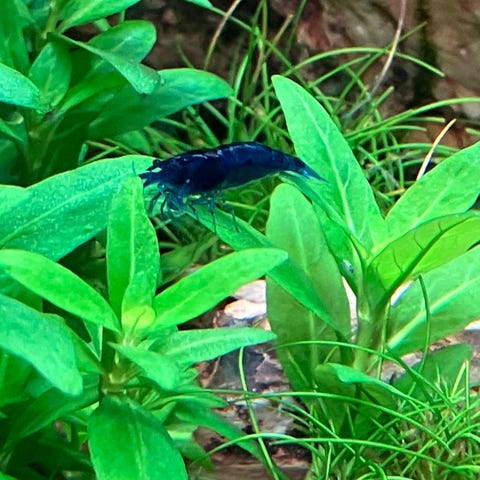 er en flot blå reje, der giver en kontrast til akvariets mange andre farver der giver en god kontrast til grønne planter, mos og akvariets andre beboer.