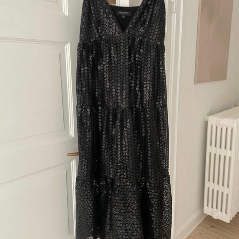 Selected Femme fest/cocktail kjole i størrelse L. Kjolen er sort med lange ærmer og har dekorative sølvfarvede palietter på forsiden. Materialet fremstår som blødt og elastisk, egnet til formelle eller festlige lejligheder.