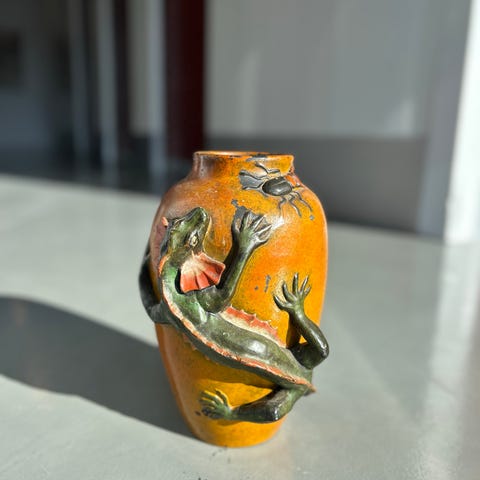 Smuk bordlampe ombygget fra P. Ipsens Enke stentøjsvase – med fuglerelief i varm orange/grøn tone. Virker fint, god stand.