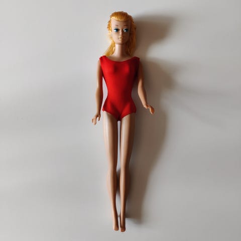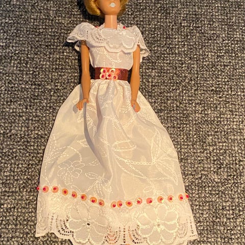 Vintage Sindy dukke iført en kjole med hvid og brun perlebroderi samt KUN 1 lilla sko. Dukken har lyst hår sat op i en høj hestehale. Kjolen er håndlavet med perlebroderi og passer til standard Barbie-størrelse.
