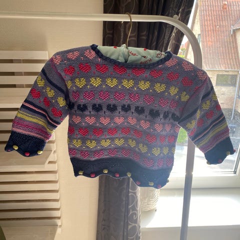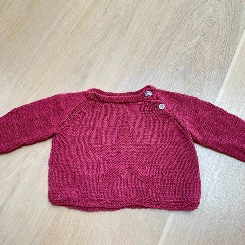 Lys lyserød trøje med stjerne på for- og bagside. Bomuld med bamseknapper. Håndstrikket, ny og ubrugt.