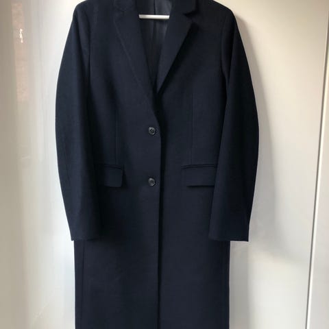 Klassisk, let frakke i navy uld/cashmere. Nærmest ny.