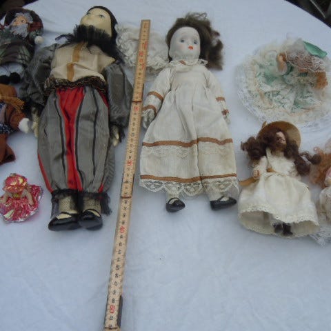 Pris: 25-75 kr pr stk, spørg for pris på den enkelte dukke. Dukken med briller og marionetdukken med sort hat er solgt.