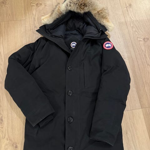 Canada Goose Jakke i størrelse M til herre. Jakken er sort og lavet til udendørs brug. Den har en hætte og er designet til at give varme og beskyttelse i koldt vejr.