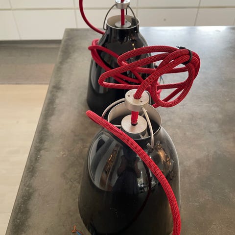 &Tradition Philippe Starck Pendel Lampe i sort farve. Lampen er designet af Philippe Starck og har en rund, flad skærm. Den er ophængt i loftet med en sort ledning og inkluderer en fjernbetjening til lysstyrkekontrol. Lampen er velegnet til brug i forskellige rum som stue eller spisestue.