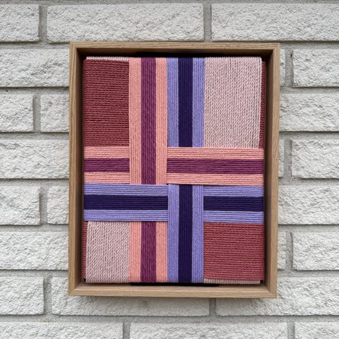 Garn vævet om kanvas og monteret i en svæveramme af massivt egetræ.