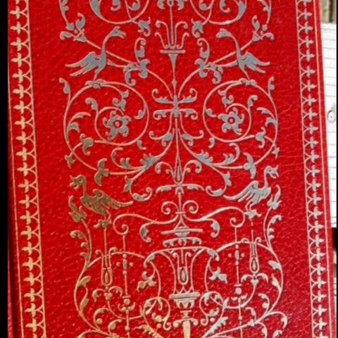Klassisk rødt læderomslag. Bøgerne har guldprægede dekorationer på omslaget og ryggen.