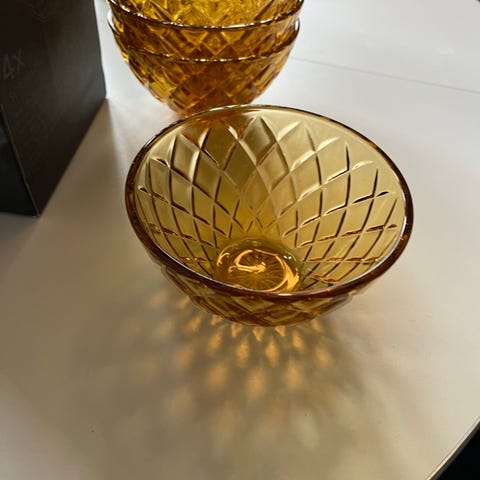 4 NYE skåle i farven Amber fra serien Sorrento, i gennemfarvet presset glas, til chips, dip , surt eller andet.. sælger andet fra samme serie..sidste kasse med skåle i denne farve