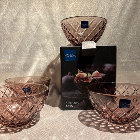 4 NYE skåle i “lyserød” fra serien Sorrento, gennemfarvet presset glas, tåler opvaskemaskine