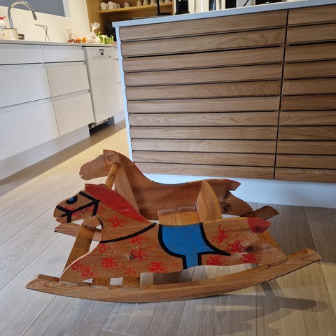 Skøn gammel snedkereret gyngehest i hvidmalet træ med sølv malede meder til de helt små børn med plads til at sidde og gynge og grine🥰.