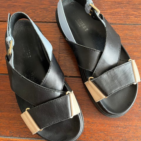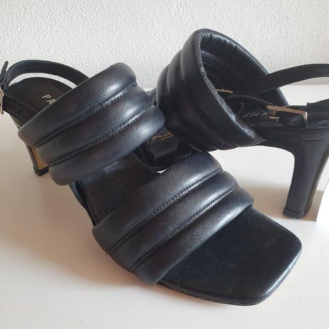 Super flotte sandaler med blokhæl fra Pavement, model Sylvia Fure, str. 37. Strop over tæerne og en om anklen, lukkes med en spænde på ydersiden. Hælhøjde 7 cm. Overdel i ruskind og pels, sål i læder. OBS: ingen æske