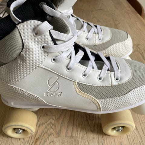 Næsten ubrugt rulleskøjter str 37, hvide guld, varsity, rio roller. Knæbeskytter, håndledsbeskytter medfølger, inliners, rollers. Side by side. Julegaveidé