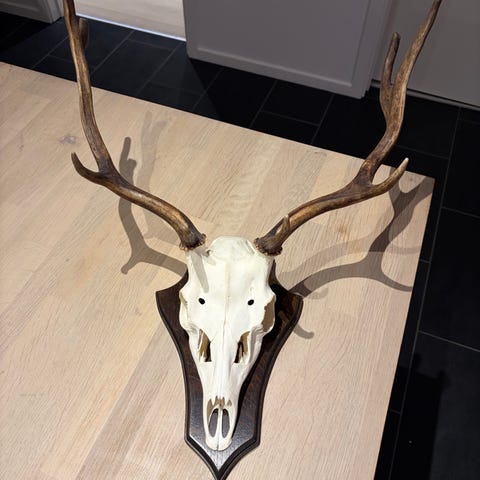 Vægophæng bestående af flere hjortehoveder monteret på væggen med forskellige hjortemotiver. Materialet ser ud til at være træ eller lignende,