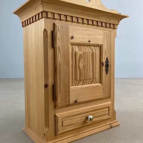Charmerende og funktionelt entremøbel i massivt fyrretræ, udført med fine snedkerdetaljer og et klassisk, tidløst udtryk. Møblet har et indbygget spejl og et praktisk skab med hylder, der giver god opbevaringsplads til hverdagens småting.
