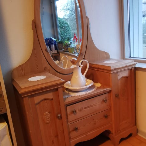 Dette møbel passer perfekt som entremøbel, hvor spejlet og skabet skaber både funktion og æstetik. Det kan også bruges som makeupbord eller sminkestation i soveværelset – ideelt til dig, der ønsker et møbel med sjæl, historie og praktisk opbevaring.