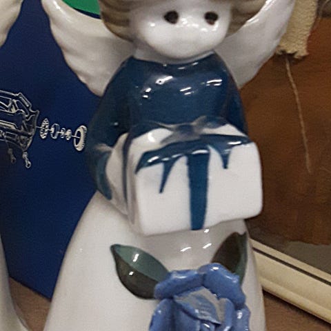 Engle figur i porcelæn. Figuren forestiller en engel med blå kjole og hvide vinger, der holder en gave. Dekoreret med blå blomsterdetaljer på kjolen. Inkluderer en klokke indeni, som kan ringes med en lille snor. Velegnet som juledekoration.