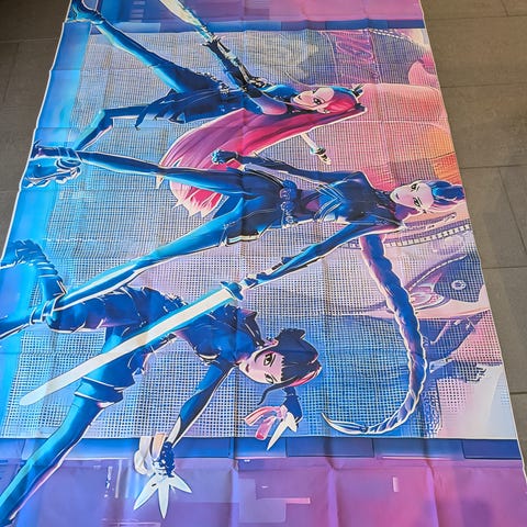Leder du efter en iøjnefaldende festdekoration? Denne K-pop Dæmonjægere-baggrund er stor nok til at skabe en ægte effekt! Den er et fremragende valg til en fødselsdagsfejring eller et uhyggeligt Halloween-tema.