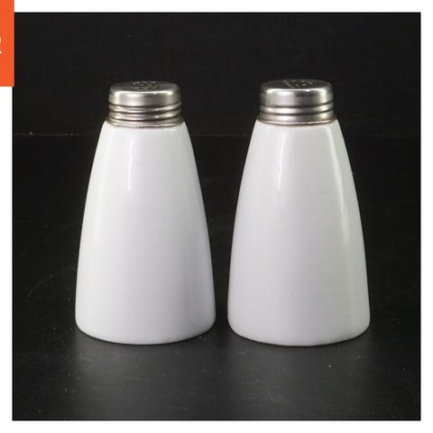 Dette sæt består af to dele: en saltbøsse og en peberkværn, begge designet i en stilren konisk form. Overdelen er lavet af skinnende metal, mens kroppen har en sort finish. Saltbøssen har små huller i låget, og peberkværnen har en knap og kværnmekanisme i bunden, hvilket gør det nemt at regulere mængden af peber. Begge dele er 14 cm høje.