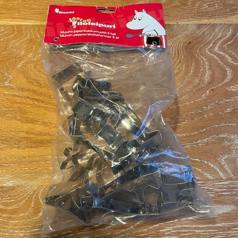 En kageform formet som figuren Mummi. Den er 22 cm lang og lavet af metal, hvilket gør den velegnet til bagning og støbning af kager til tema-events eller børnefest. Formen gengiver Mummi karakterens silhuet med detaljer som øjne, næse og ben. Der er et lille hul foroven, sandsynligvis til ophæng eller nem opbevaring. Tags: bageform, kageform, mummi, tema, figurform.