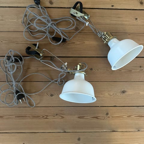 Dette er et par røde clipslamper, som kan fastgøres til forskellige overflader via et clip-system. Lampeskærmene er lavet af metal, og der medfølger lange sorte ledninger med stik. Lampeskærmene har en længde på omkring 19 cm og er designet til at give direkte, fokuseret belysning.